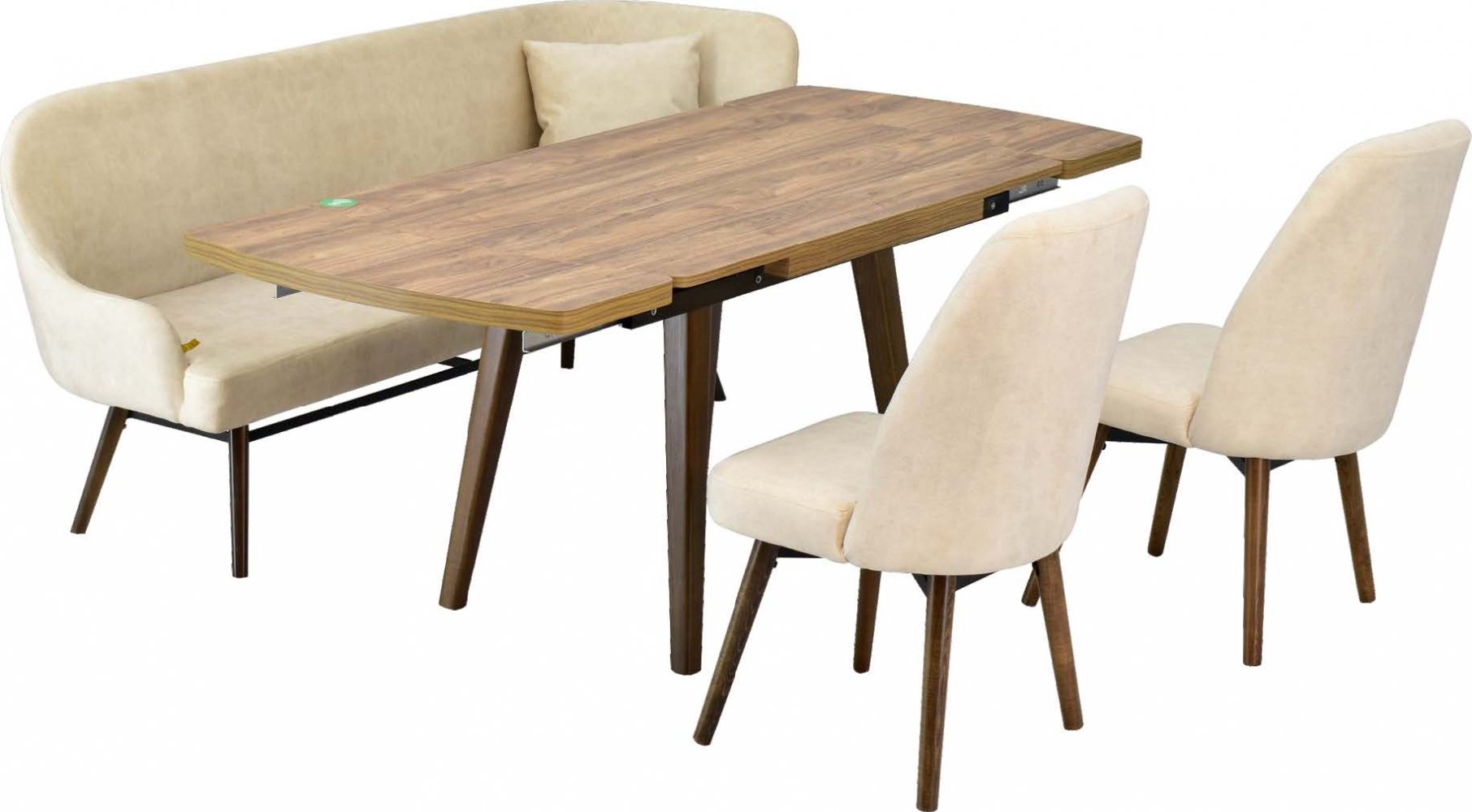 ARAS 04 80136 Kestane Yandan Açılır Yemek Masası EFES 10 Kestane Ayak Krem Bank SİDE 16 Kestane Ayak Krem Sandalye Kumaş Renkleri: Krem Sandalye Adeti: 2