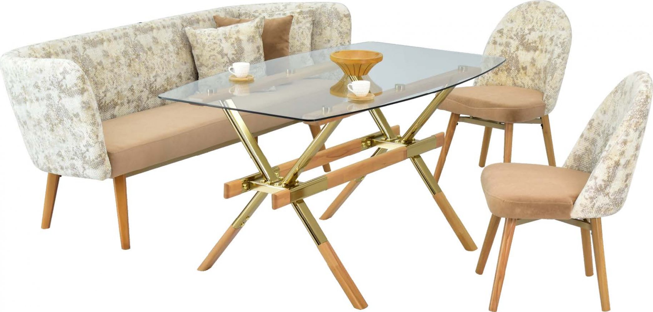 İSTANBUL 11 90152 Gold Naturel Ahşap Ayak Cam Masa BODRUM 03 Naturel Ayak Sütlü Kahve Kombin Bank MİDYAT 16 Naturel Ayak Sütlü Kahve Kombin Sandalye Kumaş Renkleri: Sütlü Kahve Kombin Sandalye Adeti: 2