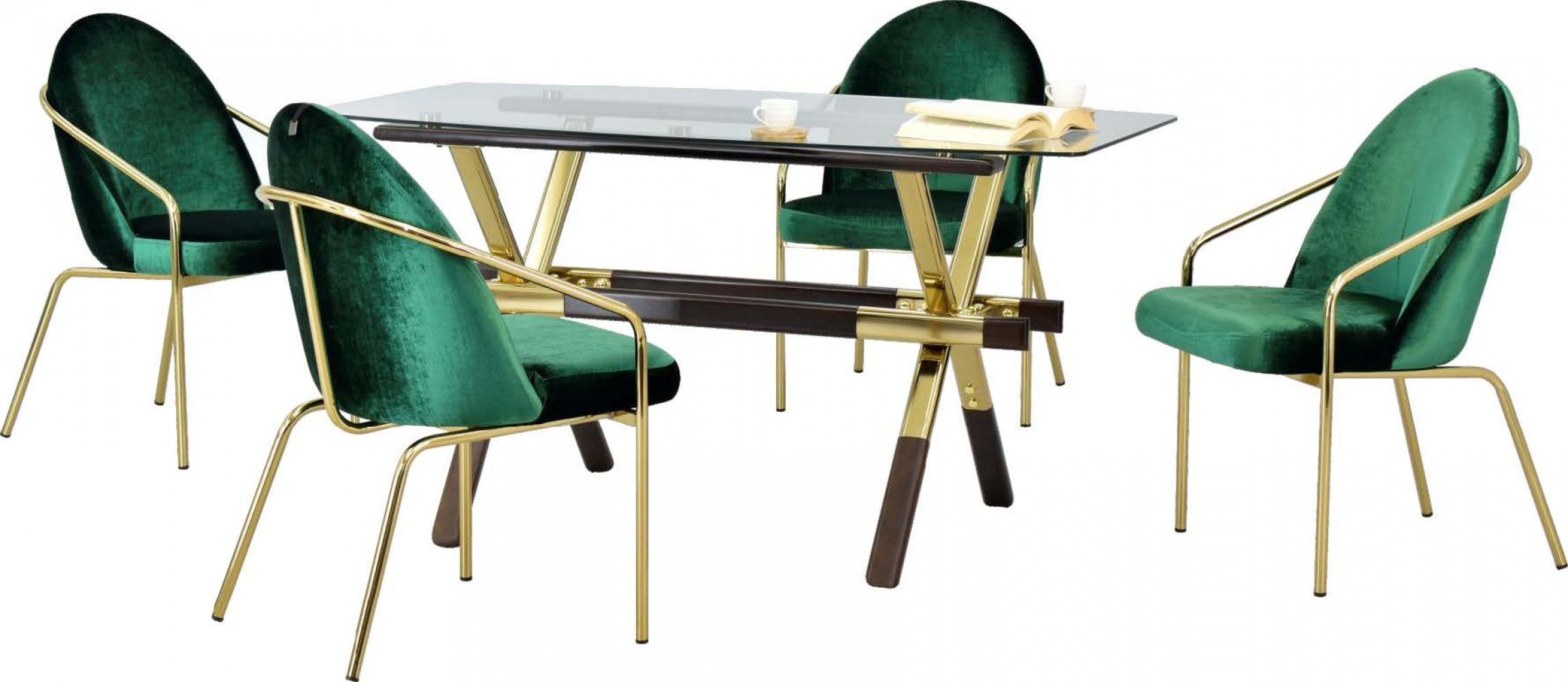 İSTANBUL 11 90152 Gold Ceviz Ayak Cam Masa MİDYAT 79 Gold Ayak Yeşil Kadife Sandalye Kumaş Renkleri: Yeşil Kadife Sandalye Adeti: 4