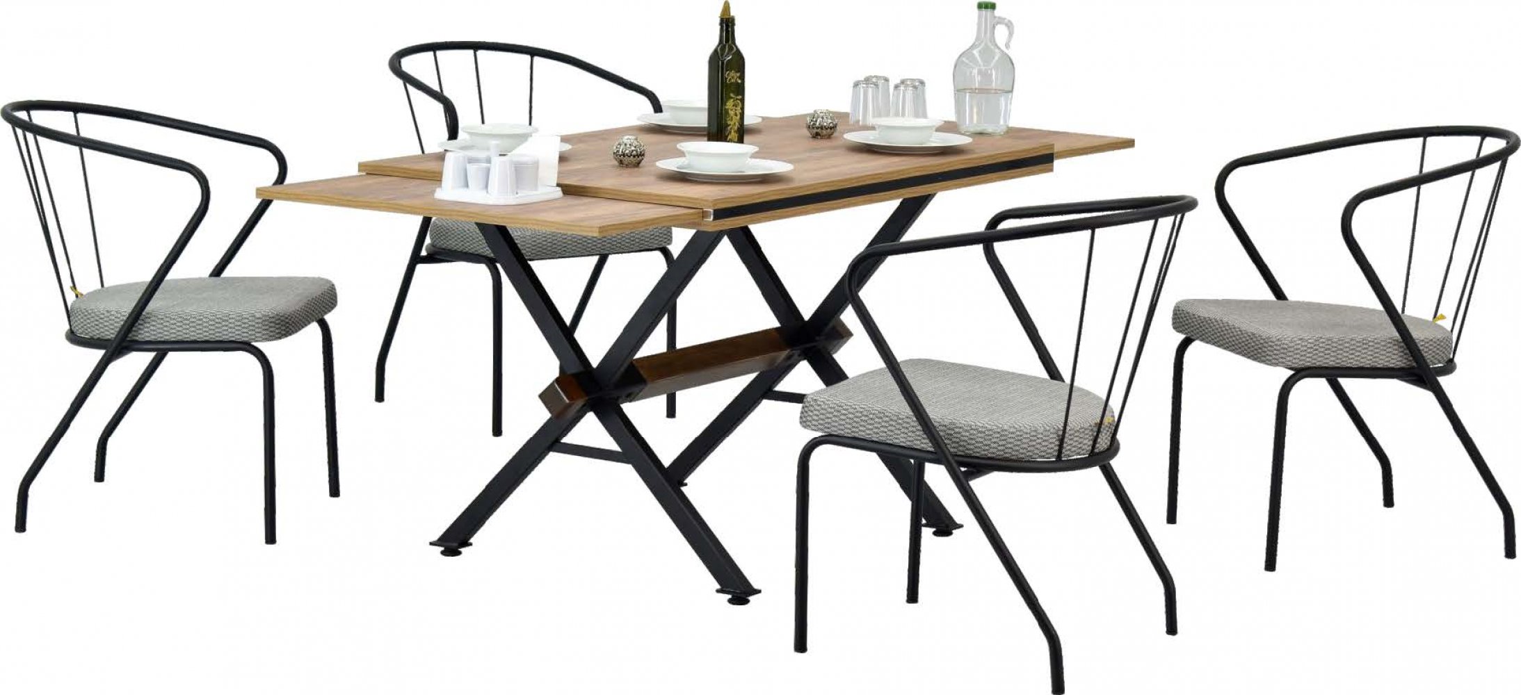 AKSA 80125 MDF Açılır Mutfak Masası Pamuk Metal Ayak Salento Gri Sandalye Kumaş Renkleri: Salento Gri Sandalye Adeti: 4 SANDALYE ÖZELLİKLERİ Pamuk Sandalye ÜRÜN ÖLÇÜLERİ — T...